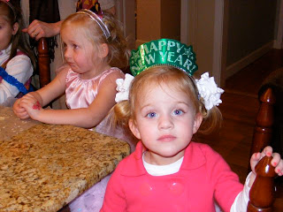 We had a good time with friends, eating laughing and just hanging out. We'll celebrated New Year's on eastern time, and I was not at all suprised, Mc made it until 11. We headed out right after, and I was hopeful she'd fall asleep in the car. I was wrong... she actually got to usher in New Year's twice... that's right, she didn't fall asleep until around 12:30am on Jan 1, 2009. What a little party animal! She was having trouble winding down from the party, so we let her get in bed with us and snuggle a while to calm down. While she was there, the ball dropped for a second time and we got to celebrate all over again.